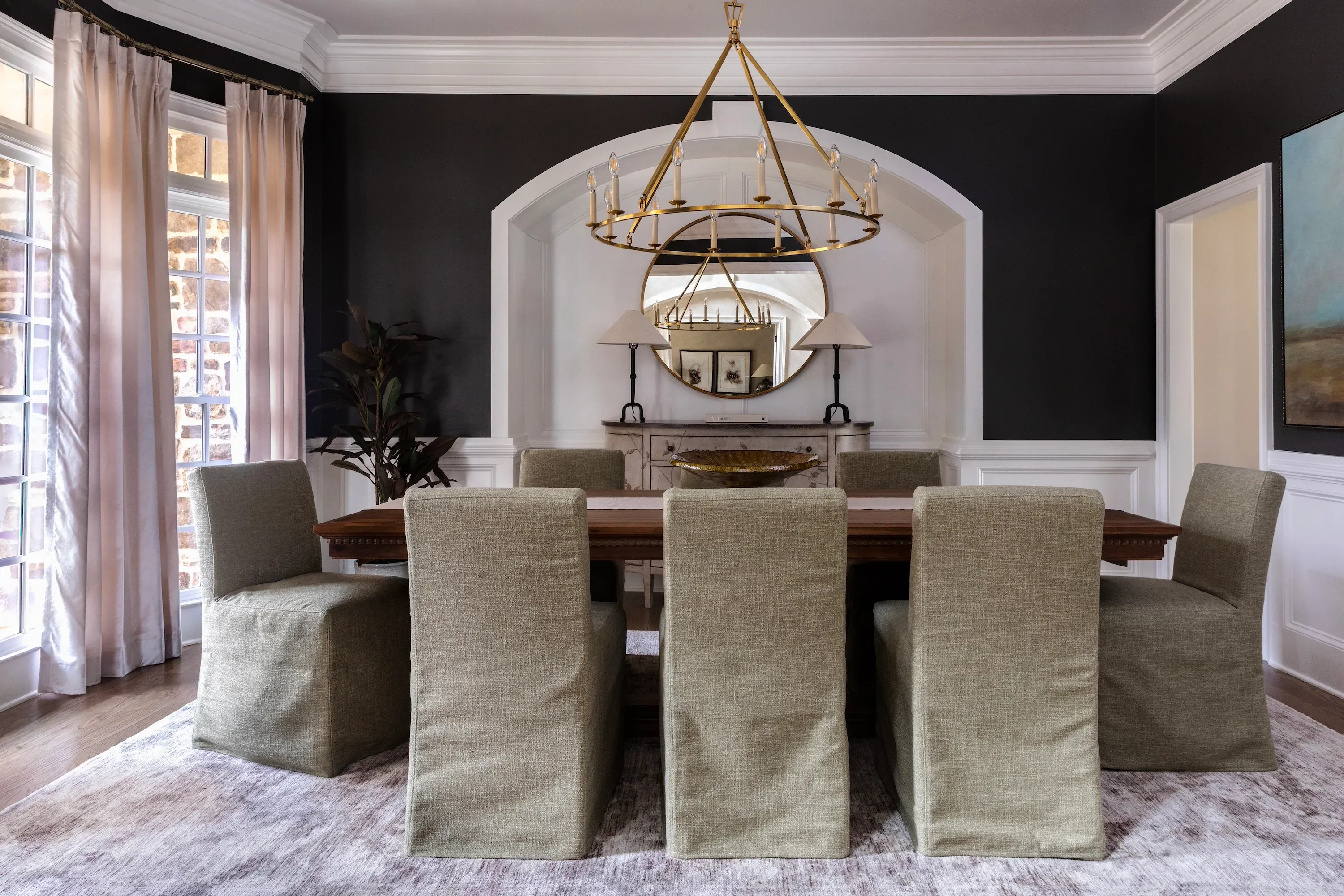 From there, we reimagined the main level with new furnishings and custom drapery throughout the office, dining room, formal living room, kitchen breakfast area, and keeping room, along with a full update to the primary suite.